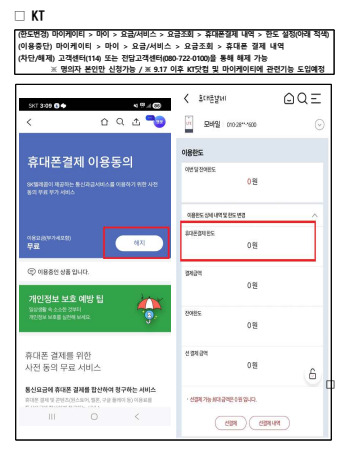 - KT: 휴대폰 결제(kt.com에서 한도/차단 가능 안내), 소액결제 피해 관련 공지(결제차단/원천차단 경로)