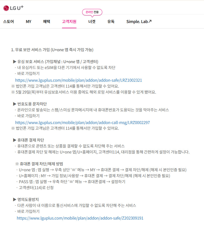- LGU+ 공지에서 차단/해제 경로를 구체적으로 안내합니다.